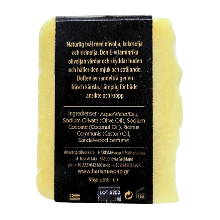 Ingredienser: Aqua/ Water/Eau, Sodim Olivate (Olive oil), Sodium Cocoate (coconut oil), Ricinus Communis (Castor oil), Sandalwood Parfym