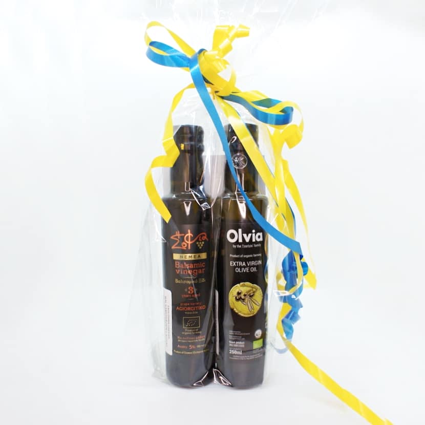 En lyxig presentpåse innehållandes en flaska extra virgin olivolja och en flaska balsamvinäger.