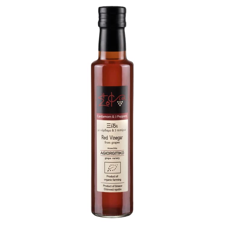 Ett smakrikt och ekologiskt rödvisvinäger med ursprung i Nemea, Greklands mest kända region för odling av den klassiska druvsorten Agiorgitiko. Mogna, ekologiska druvor vinifieras enligt traditionell rödvinsmetod och genomgår sedan en noggrant kontrollerad ättiksjäsning.
